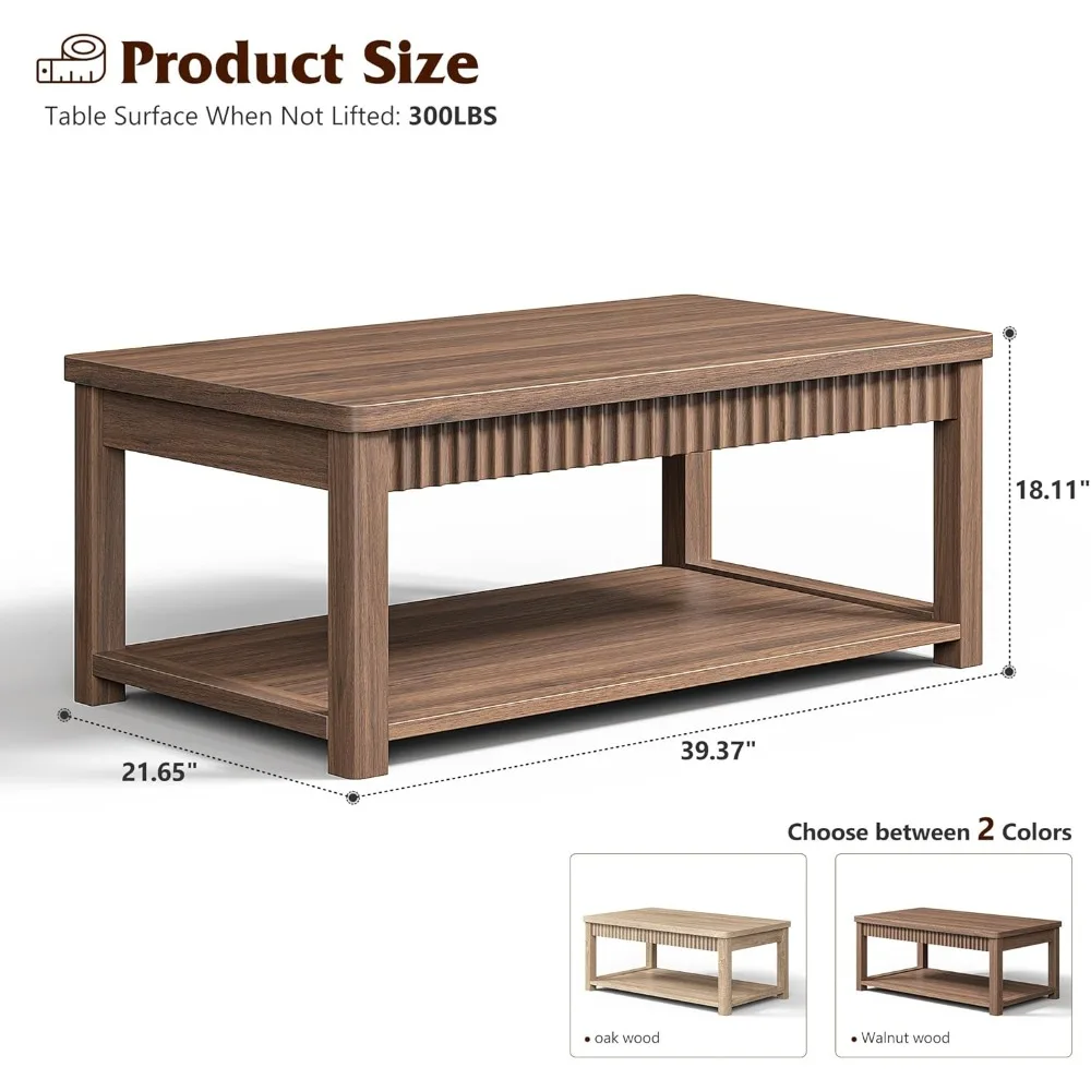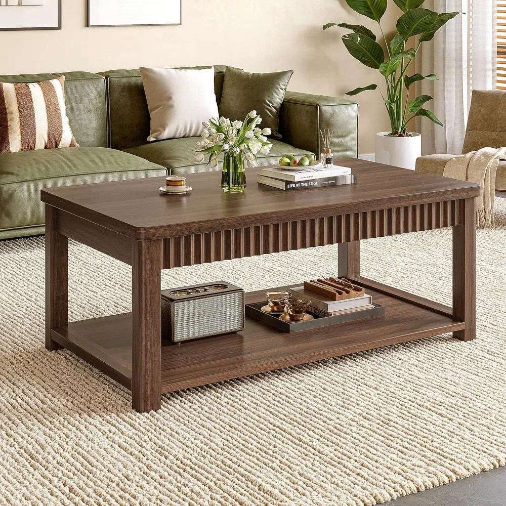 Coffee Table, 39 Inch Modern Coffee Tables for Living Room with 2-Tier Storage & Wave-Edge, Walnut Center Table for Bedroom/Offi