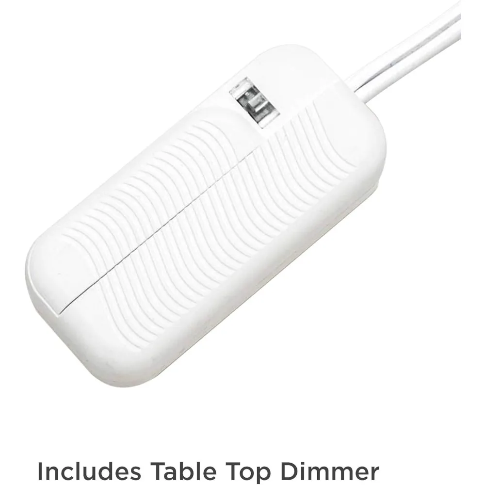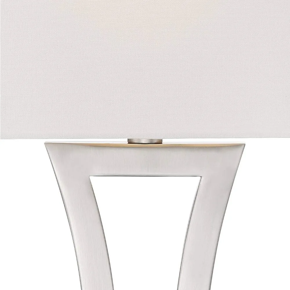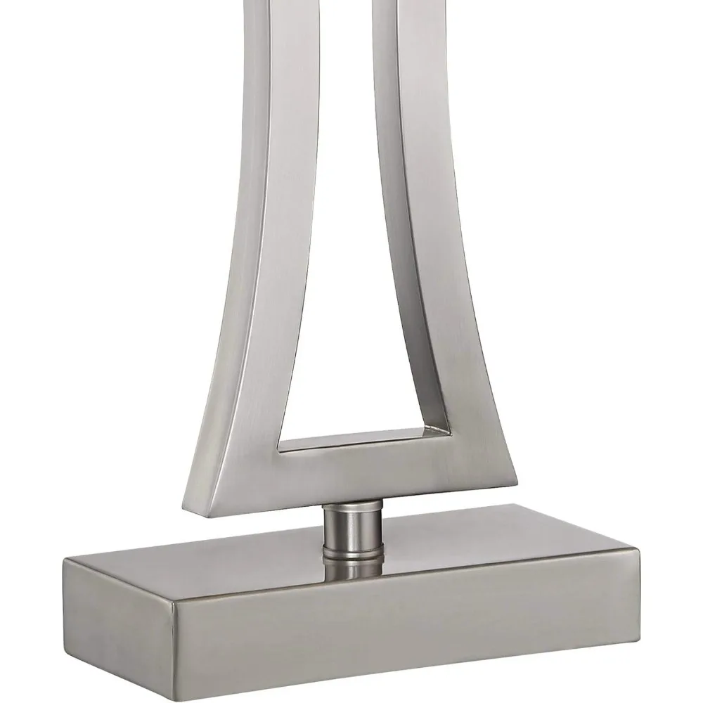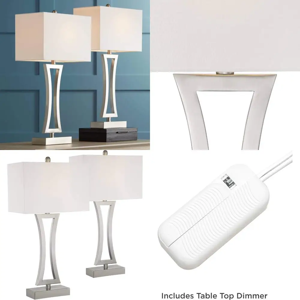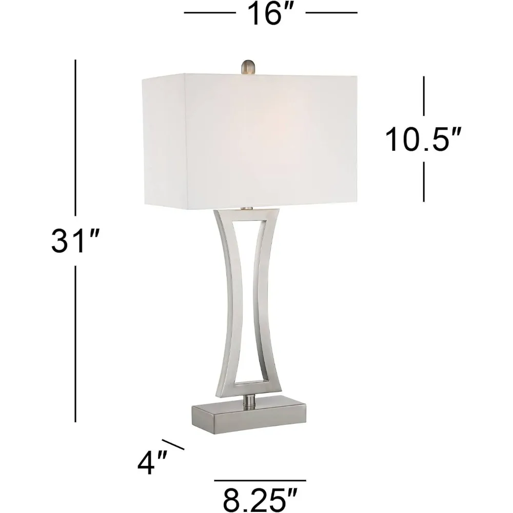 This product features a set of two lamps, each standing 31 inches tall with a base measuring 8.25 inches wide by 4 inches deep. The lamp shades are 16 inches wide, 9 inches deep, and 10.5 inches high, and each lamp weighs approximately 4.5 pounds. These lamps are designed to accommodate a maximum 100-watt standard-medium base bulb (not included) and come with on-off socket switches for easy operation. These bedside lamps offer a stylish industrial look, perfect for adding charm to your nightstand. They are dimmable table lamps, allowing for customizable lighting that is ideal for reading or enhancing the warmth of your bedside decor. The lamps also serve as elegant contemporary accents for living room side tables or entry tables, providing a sleek and coordinated look with their brushed nickel finish open bases and metal construction. The lamps come with off-white rectangular fabric shades and are equipped with 7-foot long clear cords. The package includes two white plug-in single-pole tabletop dimmers with slider switches, enabling the lamps to function like dimmable 3-way designs. Each dimmer has an 8-foot long cord and is compatible with halogen, incandescent bulbs, and most dimmable CFL and LED bulb designs, with a maximum capacity of 150 watts. The lamps may be shipped in multiple boxes and could arrive at different times. This versatile table lamp set is an excellent addition to end tables or consoles, adding a sophisticated decorative touch to your living room, kitchen, or counter area.