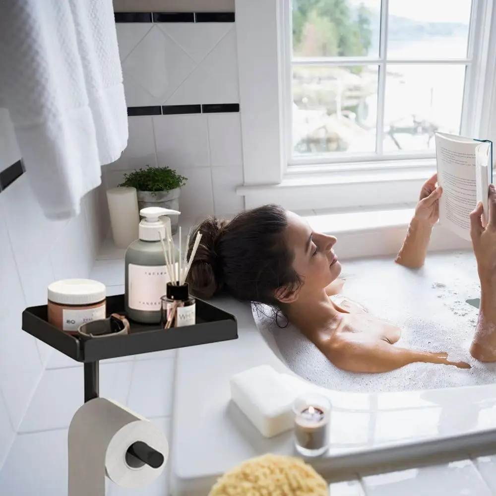Organize your bathroom without nail holes using our Toilet Paper Holder Stand with storage rack. This practical stand can be placed freely and features a washable surface that can meet your different needs. Say goodbye to messy bathrooms with this functional stand.