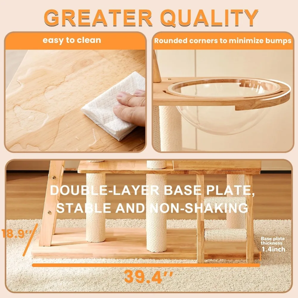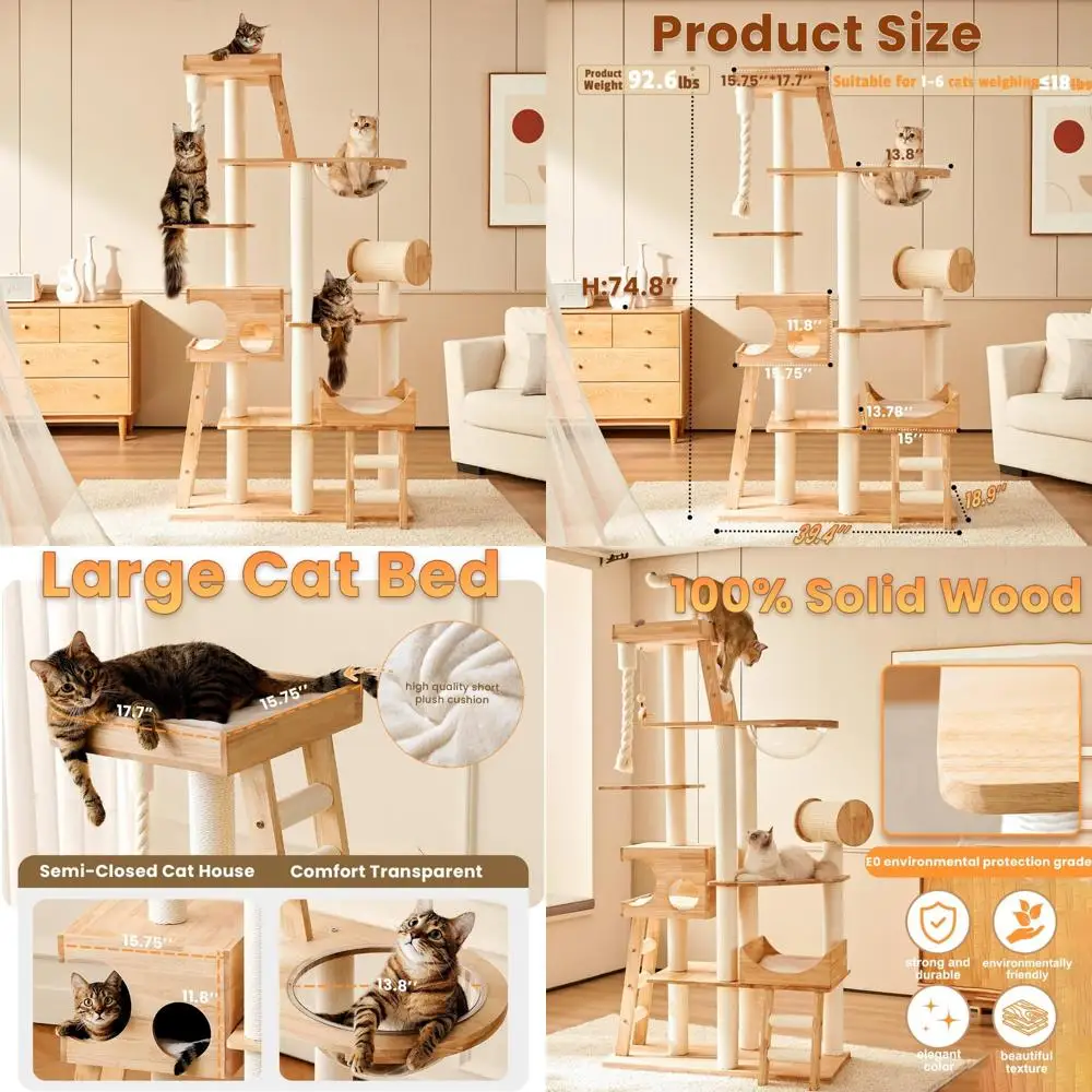 This modern cat tower, standing at 74.8 inches, is designed with big cats in mind. It features a spacious 15.7 x 15.7 x 12-inch condo, a 15.7 x 18-inch bed, and another 15 x 13.7-inch bed, along with two solid wood sisal climbing ladders and multiple scratching posts, providing a safe haven for cats of all sizes and accommodating up to six cats weighing up to 18 pounds simultaneously. The luxury cat tree is a multi-functional piece of furniture, offering various facilities for both rest and entertainment. It includes three cat beds with removable soft cushions, three climbing ladders, four solid wood platforms, a transparent bowl, toys, and multiple sisal scratching posts, ensuring your cat's daily needs are met. Constructed from natural wood, this cat furniture boasts a strong load-bearing capacity and durability. The hardwood is resistant to deformation, offering a simple and odorless design. Safety and stability are paramount, with the cat tree made from E0 grade environmentally friendly materials. Each scratching post can support up to 265lbs, crafted from high hardness kraft paper tube, ensuring sturdiness and a long lifespan. The base measures 40 x 19 inches, providing excellent stability and support to prevent wobbling during your cat's playful activities. Maintenance is a breeze with this cat tree, as it features a waterproof surface that can be easily cleaned with a damp cloth, making it more convenient to maintain than traditional cat trees. Specializing in high-quality, unique, and modern cat trees, the company focuses on creating cat-friendly furniture for every feline. As a cat lover, you can expect new and innovative designs to be introduced regularly.